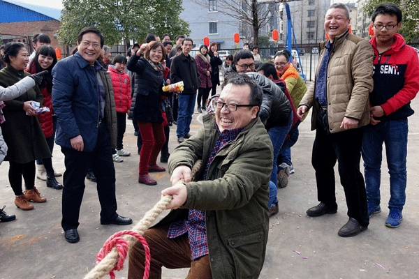 活動在震天的煙花爆竹聲、歡慶的鑼鼓聲、歡快的秧歌舞中拉開了序幕,工會舞蹈興趣組的女職工身穿紅色節日裝,手提紅燈籠進行了喜慶方隊的表演;參加游藝活動的職工、家屬已有序在各項活動前排好了隊,飛鏢、搶凳子、定點投籃、齊心協力,皮球入門、盲人敲鑼、釣魚、套環、擲沙包、筷子入瓶等刺激好玩的游戲逐一展開,每種游戲項目都吸引了許多職工、家屬參加,大家爭先恐后,積極踴躍參加,現場人頭攢動,氣氛熱烈,笑聲不斷。搶凳子吸引了大批兒童,既要跑起來又要聽裁判的敲鑼聲,小朋友們扎實秀了一把;三人配合項目體現了齊心協力合作精神……;再看各分會拔河隊員個個鉚足了勁,使盡渾身力氣參與較量,呼喊聲、加油聲一浪高過一浪,笑聲、加油聲互相映襯,此起彼伏。多姿多彩的文化活動將節日氣氛推向了高潮。