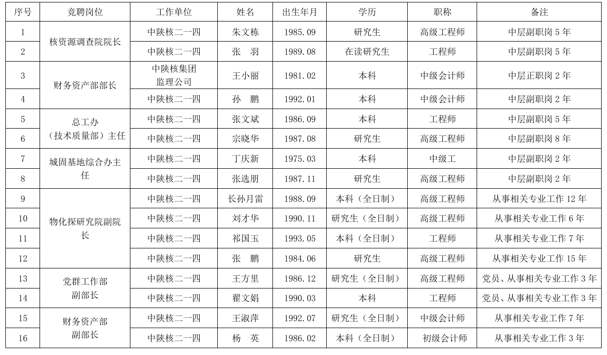 根據(jù)中陜核工業(yè)集團二一四大隊有限公司《中層管理人員選聘工作方案》有關(guān)要求,現(xiàn)對資格審查通過的報名人員予以公示: