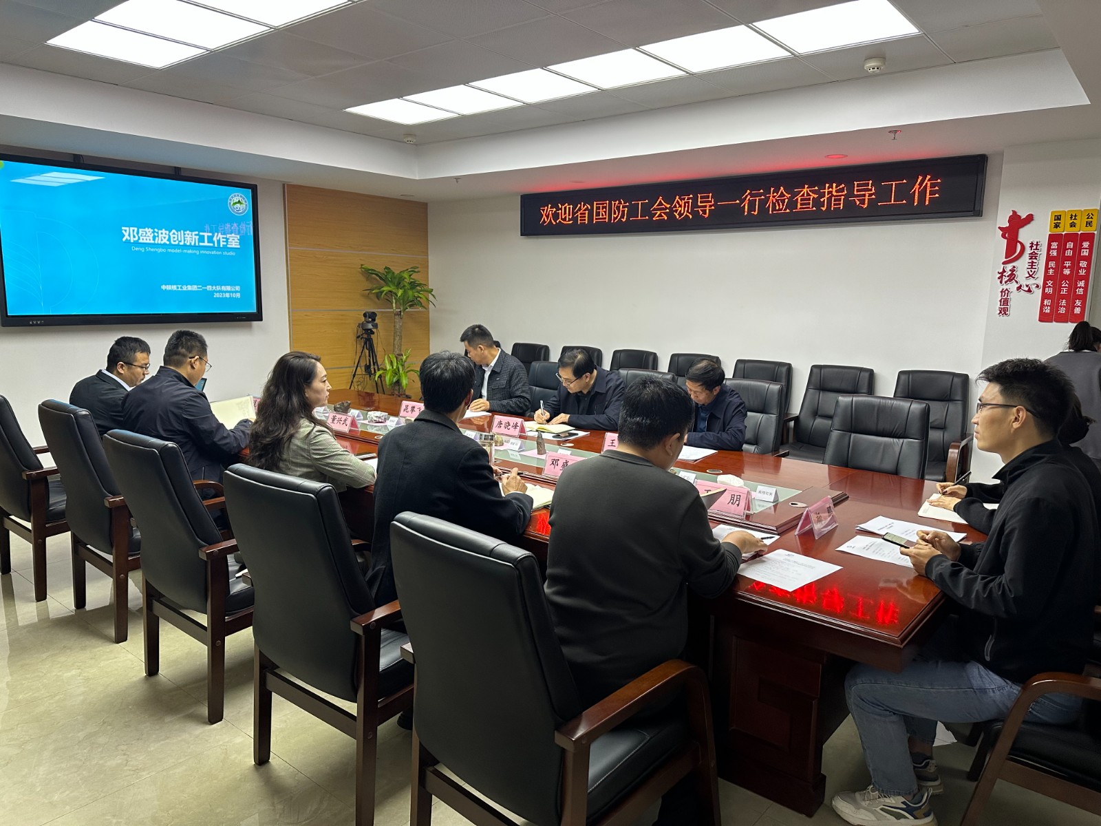 2023年10月24日下午,陜西省國防工會經濟技術部部長唐曉峰、集團工會副主席劉晶等一行蒞臨公司預驗收鄧盛波創(chuàng)新工作室,公司黨委書記、董事長鄧盛波、工會主席董興武、總工程師王朋等陪同。