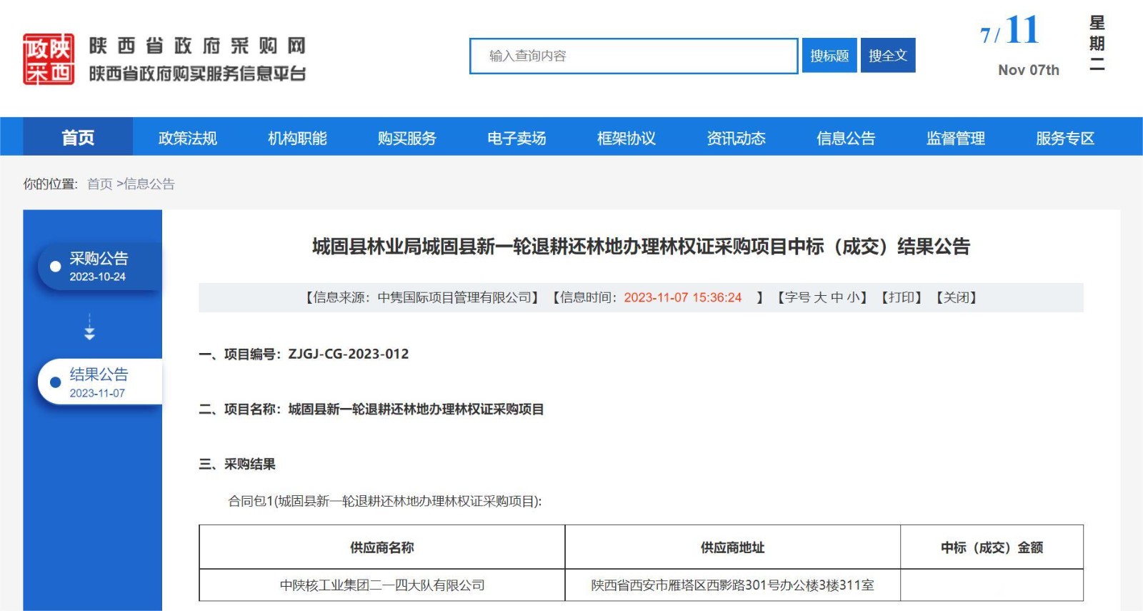 11月7日,據陜西省政府采購網公告,公司成功中標《城固縣新一輪退耕還林地辦理林權證采購項目》。