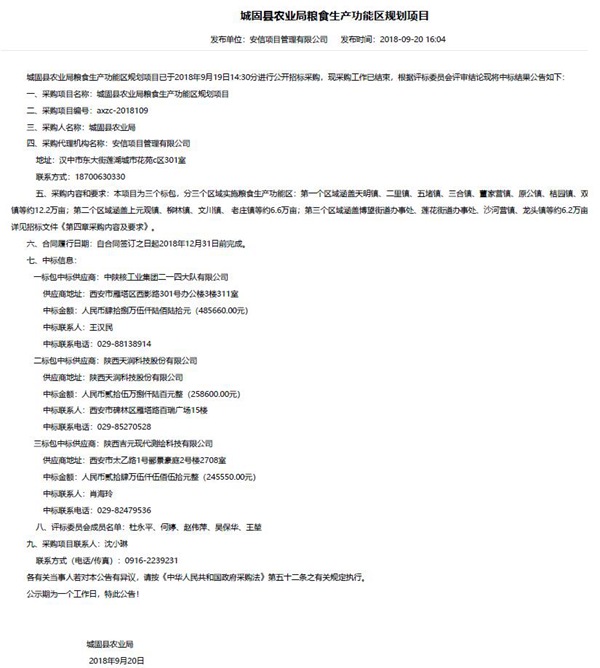 2018年9月20日,在城固縣農(nóng)業(yè)局糧食生產(chǎn)功能區(qū)規(guī)劃項目進(jìn)行公開招標(biāo)采購中,公司憑借詳實完善的技術(shù)方案,成功中標(biāo)“城固縣農(nóng)業(yè)局糧食生產(chǎn)功能區(qū)規(guī)劃項目”。