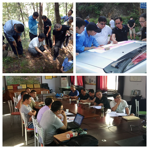 李靠社一行頂著烈日深入野外現場,首先對項目的野外工程和礦化點進行仔細的檢查和了解,并查看了鉆孔巖心及巖礦標本。李靠社野外實地檢查時一邊查看圖件、一邊對照實際工程檢查施工、編錄質量等情況。在野外現場分別與項目技術人員詳細詢問和探討,并向年輕技術人員傳授了豐富的找礦經驗。