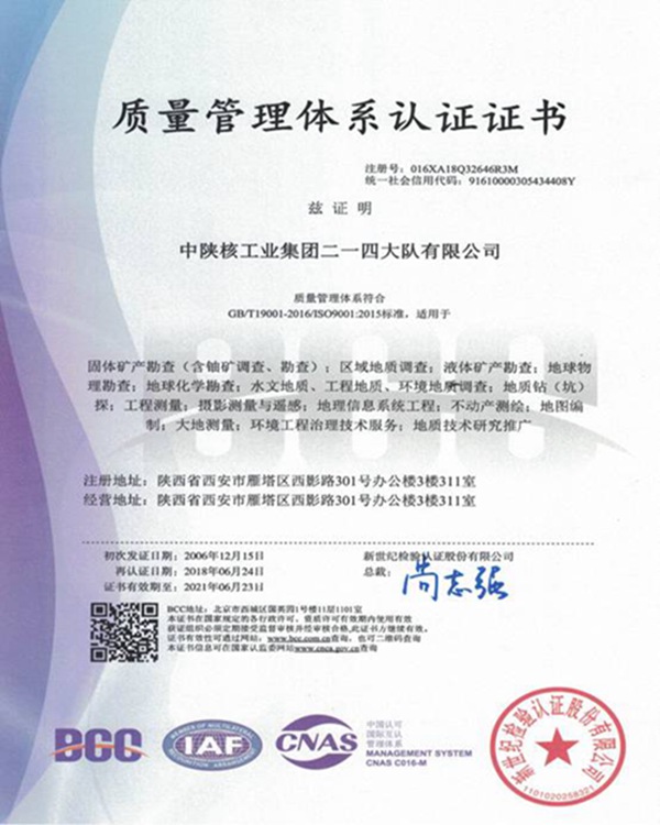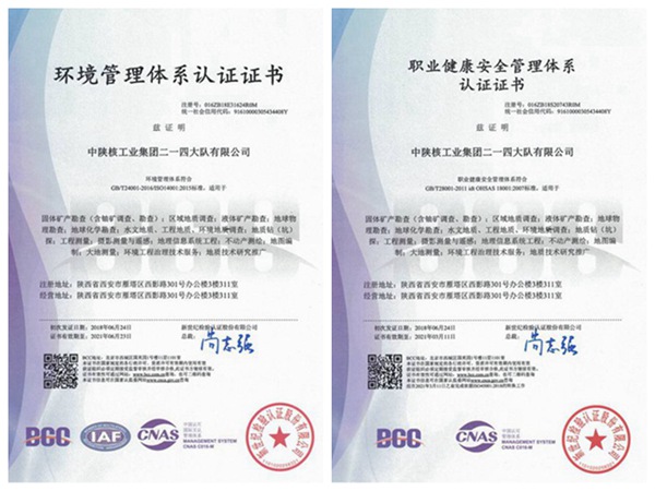 通過(guò)質(zhì)量管理體系再認(rèn)證和標(biāo)準(zhǔn)轉(zhuǎn)版審核、環(huán)境和職業(yè)健康安全管理體系的審核,在固體礦產(chǎn)勘查(含鈾礦調(diào)查、勘查);區(qū)域地質(zhì)調(diào)查;液體礦產(chǎn)勘查;地球物理勘查;地球化學(xué)勘查;水文地質(zhì)、工程地質(zhì)、環(huán)境地質(zhì)調(diào)查;地質(zhì)鉆(坑)探;工程測(cè)量;攝影測(cè)量與遙感;地球信息系統(tǒng)工程;不動(dòng)產(chǎn)測(cè)繪;地圖編制;大地測(cè)量;環(huán)境工程治理技術(shù)服務(wù)等方面通過(guò)ISO9001:2015版質(zhì)量管理體系證書(shū)、ISO14001:2015版環(huán)境管理體系證書(shū)、OHSAS 18001:2007版職業(yè)健康安全管理體系認(rèn)證,獲得ISO9001:2015版質(zhì)量管理體系證書(shū)、ISO14001:2015版環(huán)境管理體系證書(shū)、OHSAS 18001:2007版職業(yè)健康安全管理體系認(rèn)證證書(shū)及標(biāo)志使用授權(quán)書(shū)。