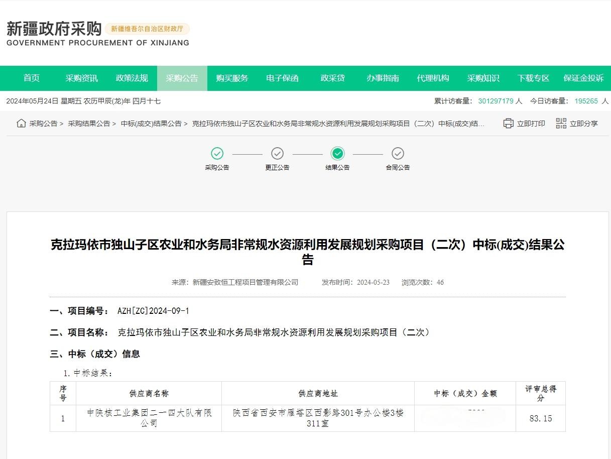 5月24日,通過新疆政府采購網(wǎng)結(jié)果公告獲悉,公司水工環(huán)院成功中標(biāo)克拉瑪依市獨山子區(qū)農(nóng)業(yè)和水務(wù)局非常規(guī)水資源利用發(fā)展規(guī)劃采購項目。